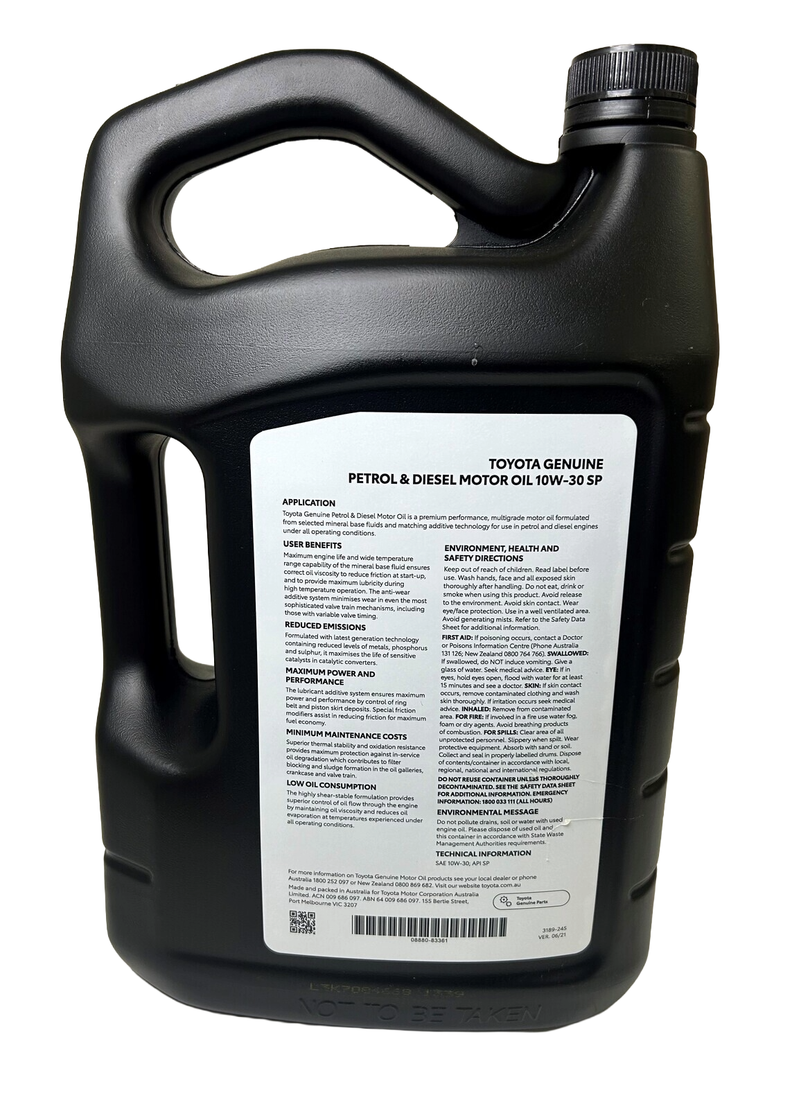 Genuine Toyota Synthetic Engine Oil is a premium performance, multigrade motor oil formulated from selected mineral base fluids and matching additive technology for use in petrol and diesel engines under all operating conditions.