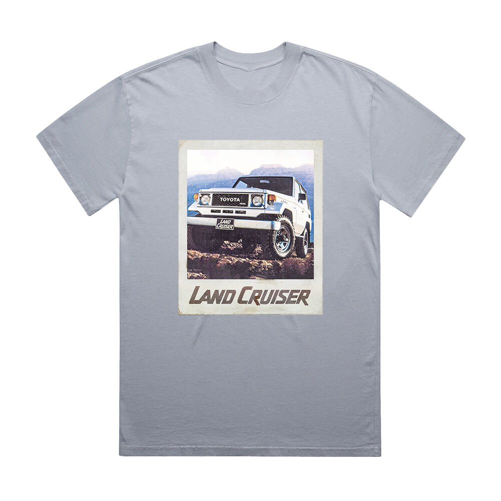 The Polaroid Heavyweight T-Shirt in dusty blue combines classic style with durability. Made from high-quality, heavyweight fabric, this tee is built to last while offering comfort and a premium feel. Featuring a bold white LandCruiser graphic in a Polaroid-style design, it captures the spirit of adventure and nostalgia. With its relaxed fit and sturdy construction, this t-shirt is a perfect choice for vintage LandCruiser fans and off-road enthusiasts looking for both style and lasting wear.