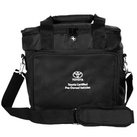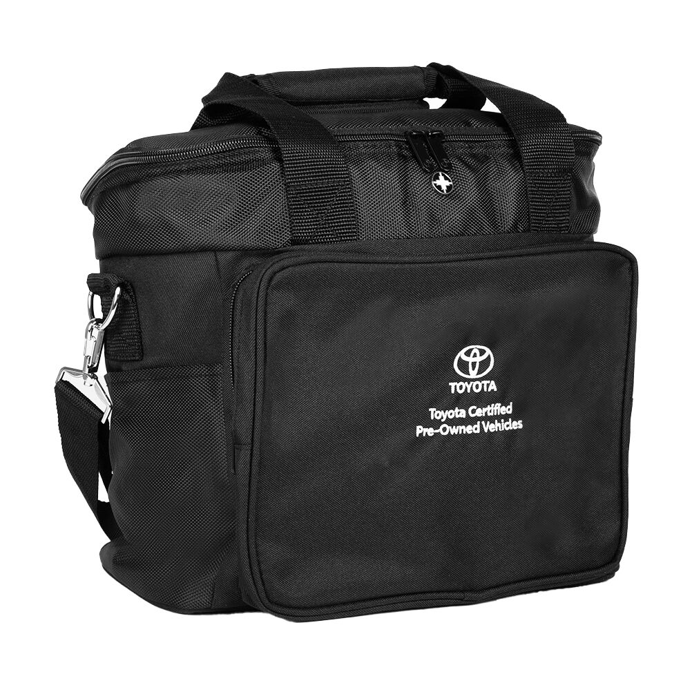 This cooler bag features strong woven carry handles with a Velcro cuff, and an adjustable, removable shoulder strap with a shoulder pad for comfortable carrying. Additional features include a large zippered top closure, a front zippered pocket, and slip pockets on both sides, providing ample storage for all your essentials.