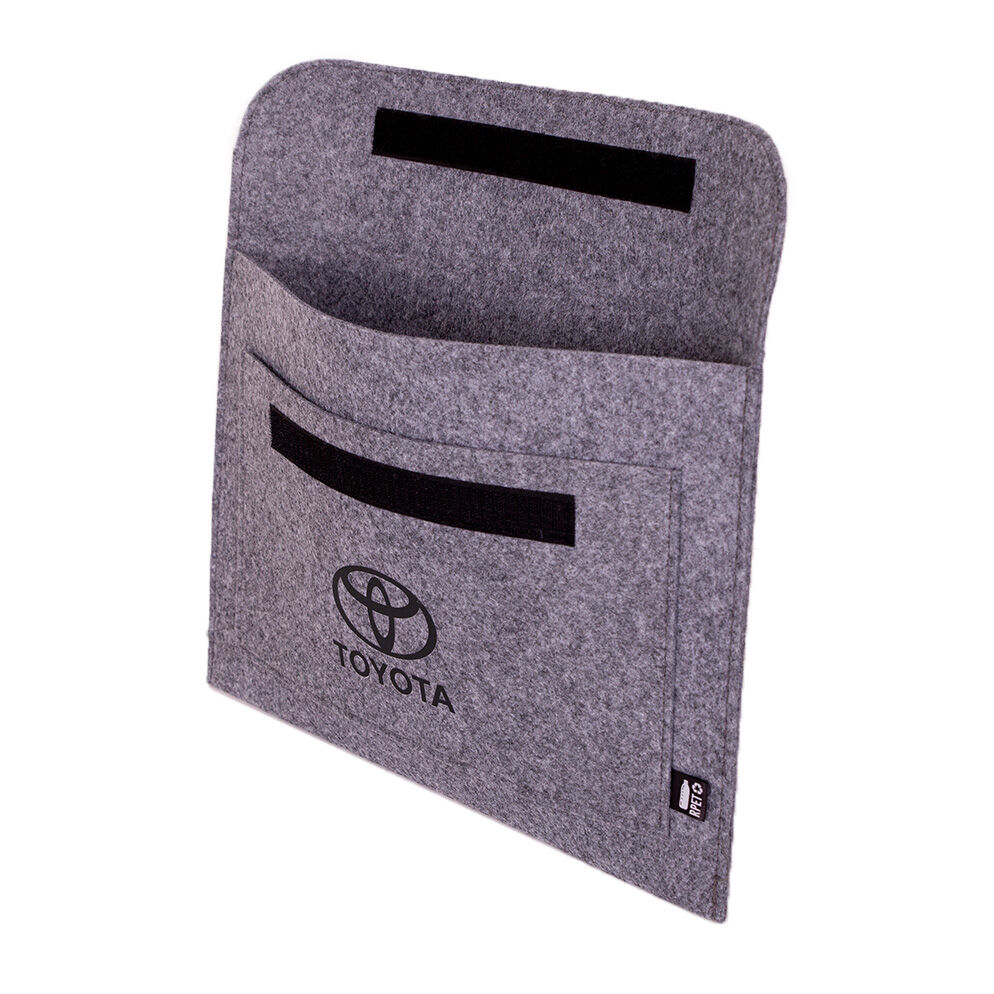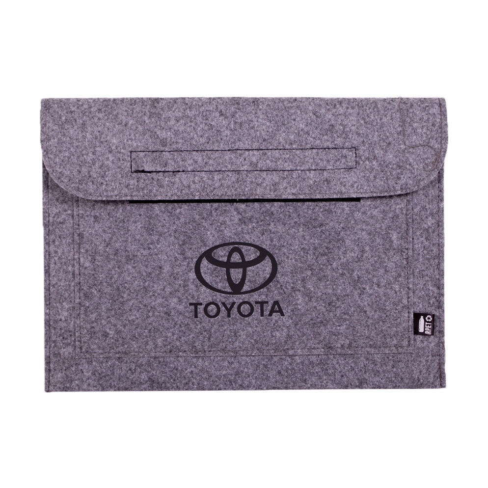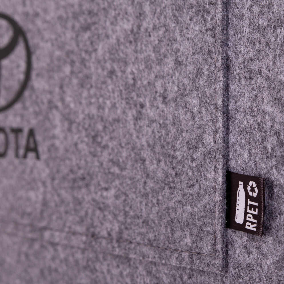 Recycled PET felt fabric laptop pouch with velcro closure and front slip pocket.