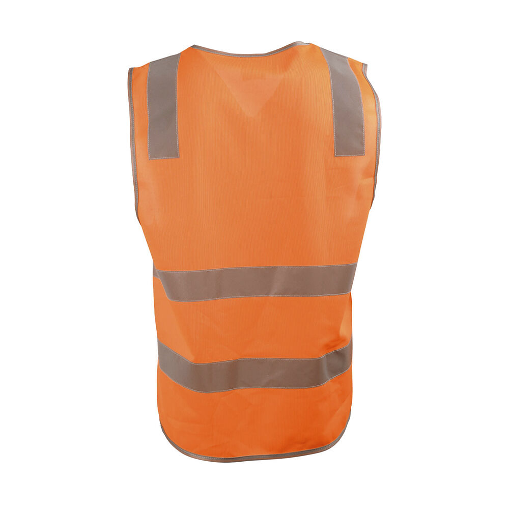 120gsm 100% polyester high visibility safety vest with reflective tapes, velcro closure and grey banding to protect fraying of fabric.