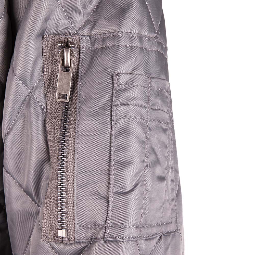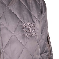 This sleek Toyota Quilted Bomber Jacket, in gunmetal grey, combines style with practicality. It features a warm polyester quilt with a satin lining for added comfort. The jacket includes a functional sleeve pocket with a pen slot and a durable nylon zipper.
